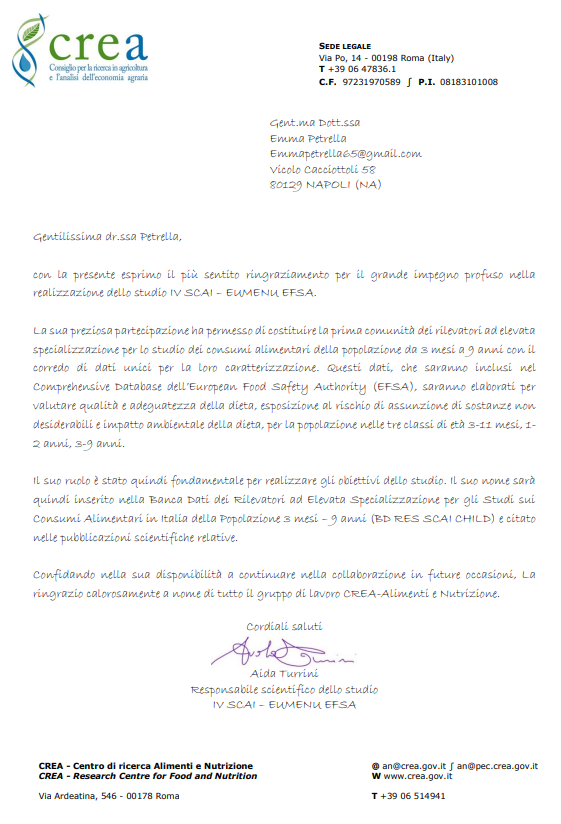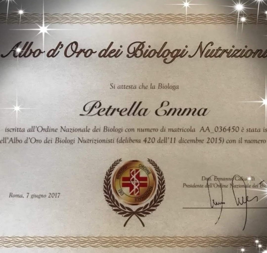 La Dottoressa Emma Petrella laureata in Scienze Biologiche nel 1990 presso l’Università Federico II di Napoli con la votazione di 110/110, la dottoressa Emma Petrella ha proseguito la sua formazione specializzandosi in Scienze dell’Alimentazione presso l’Università Luigi Vanvitelli di Napoli, conseguendo la votazione di 70/70.
